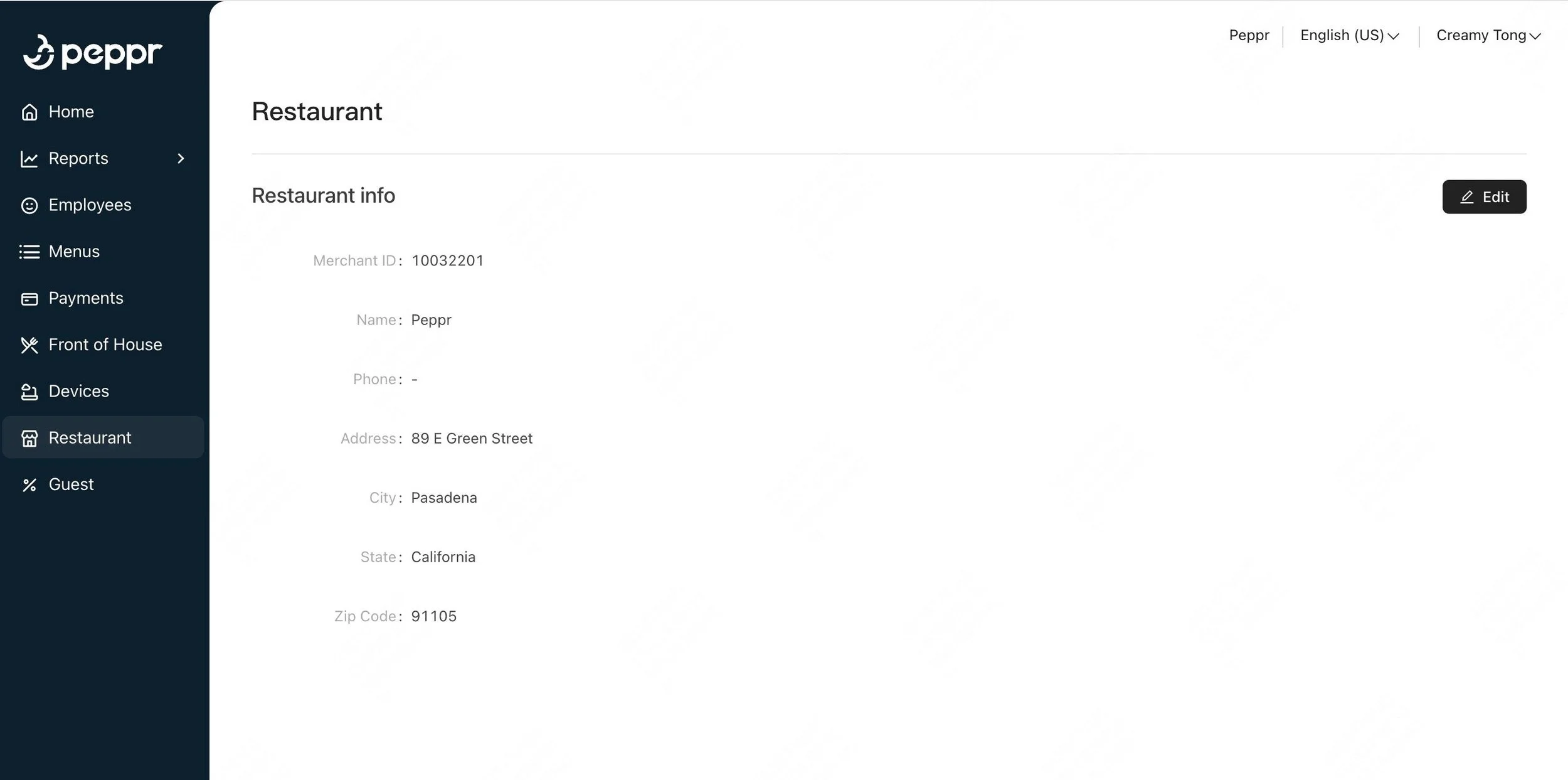From the navigation bar, go to Restaurant and click Edit to enter restaurant information.